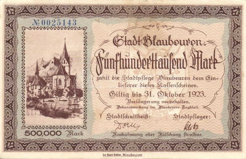 Beschreibung: Német Birodalom/Weimari Köztársaság/Blaubeuren 1923.10.31. 500.000M T:II