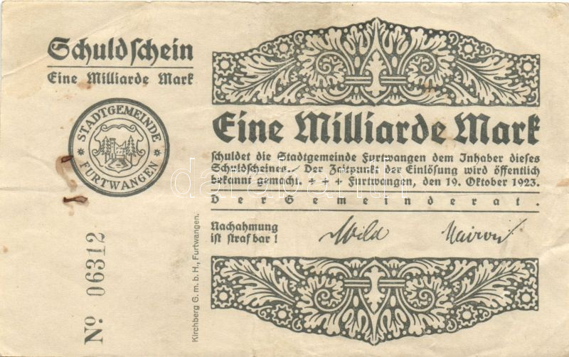 Beschreibung: Német Birodalom/Weimari Köztársaság/Furtwangen 1923.10.19. 1000.000.000M nyomdanévvel T:II/III