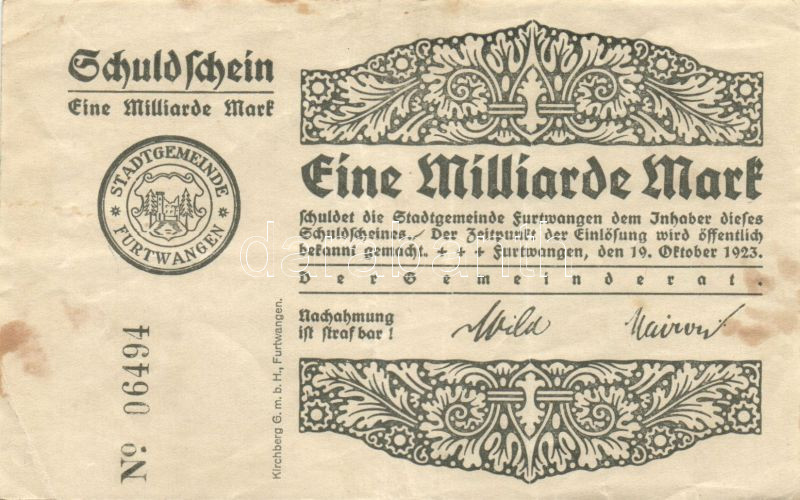 Beschreibung: Német Birodalom/Weimari Köztársaság/Furtwangen 1923.10.19. 1000.000.000M nyomdanévvel T:II
