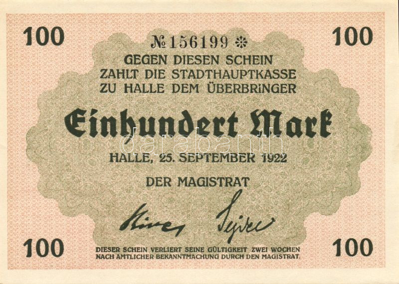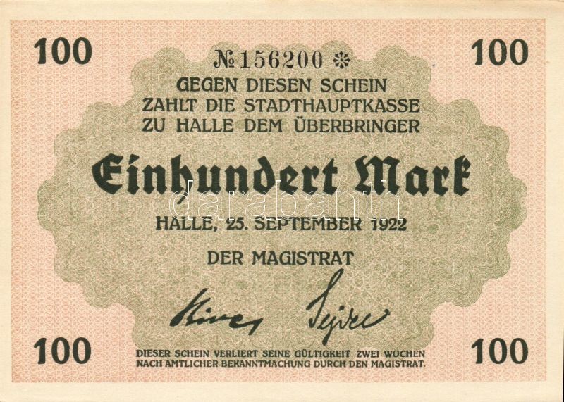 Beschreibung: Német Birodalom/Weimari Köztársaság/Halle 1922.09.25. 100M (2x) egymásutáni sorszámmal T:I,I-