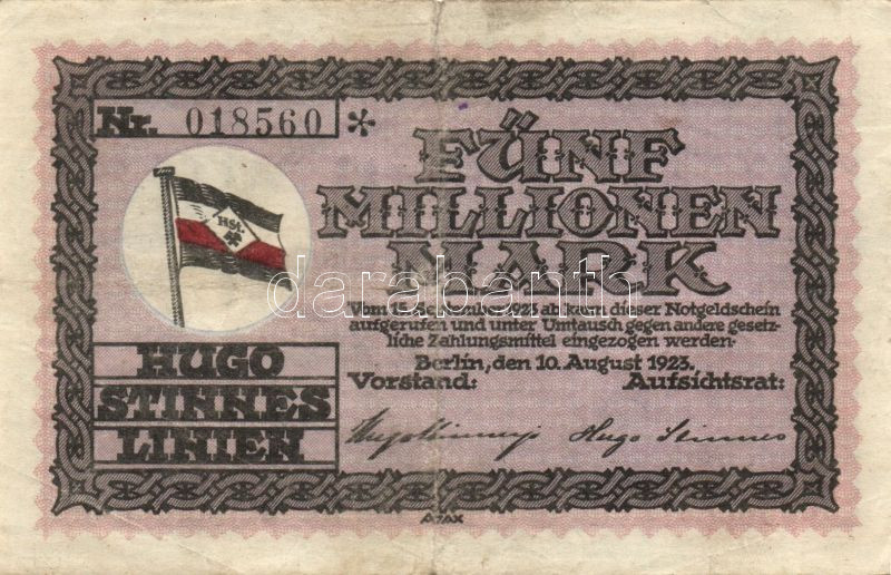 Német Birodalom/Weimari Köztársaság/Hamburg/Hugo Stinnes Linien 1923.8... https://www.darabanth.com/de/113-Fernauktion/113.0/Numismatik/~100172/Nemet-BirodalomWeimari-KoztarsasagHamburgHugo-Stinnes-Linien-1923810-5000000M-fekete-sors~II249705