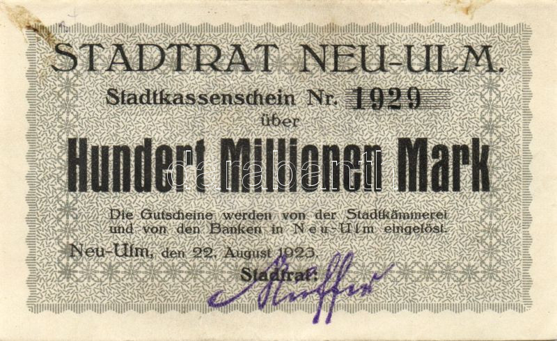 Német Birodalom/Weimari Köztársaság/Neu-Ulm 1923.8.22. 100.000.000M T:... https://www.darabanth.com/de/113-Fernauktion/113.0/Numismatik/~100172/Nemet-BirodalomWeimari-KoztarsasagNeu-Ulm-1923822-100000000M-TII-~II249829