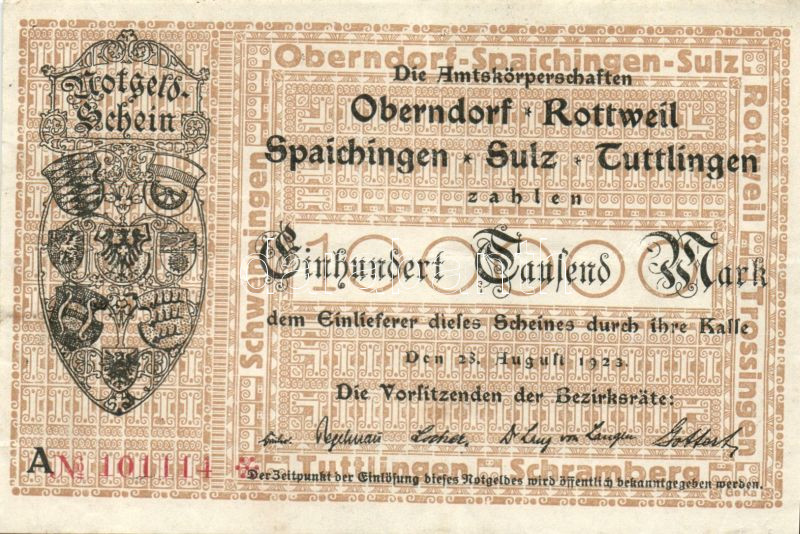 Beschreibung: Német Birodalom/Weimari Köztársaság/Oberndorf, Bottweil, Spaichingen, Sulz, Tuttlingen 1923.8.28. 100.000M Bogenkreuzmuster v.j.-lel T:II
