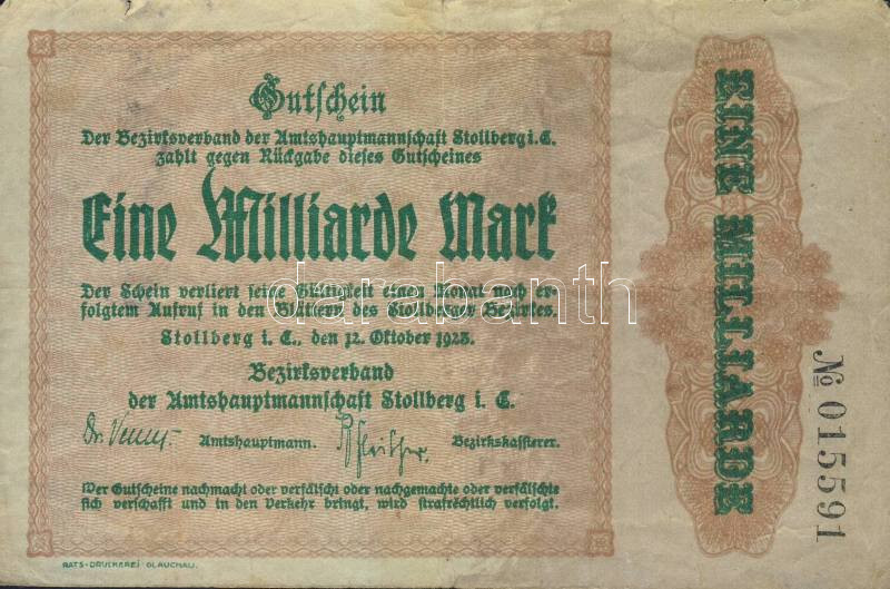 Beschreibung: Német Birodalom/Weimari Köztársaság/Stollberg 1923.10.12. 1000.000.000M T:III