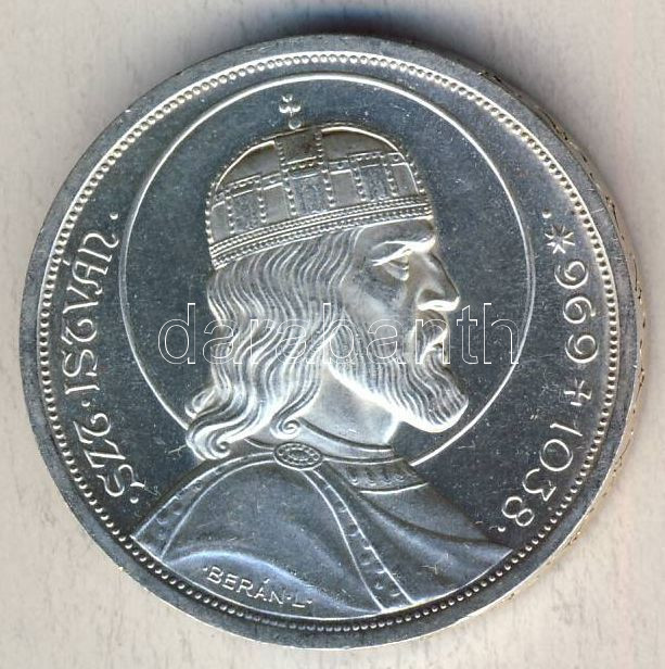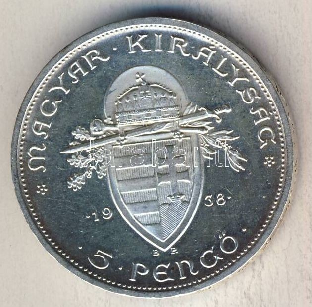 1938. 5P Ag "Szt István" T:1/2+ https://www.darabanth.com/de/113-Fernauktion/113.0/Numismatik/~100185/1938-5P-Ag-Szt-Istvan-T12plus~II290843