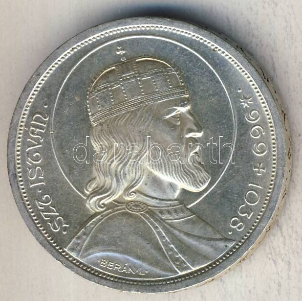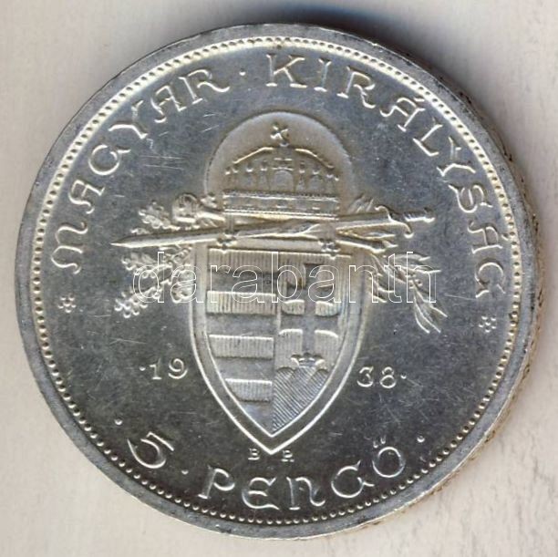 1938. 5P Ag "Szt István" T:1/2+ https://www.darabanth.com/de/113-Fernauktion/113.0/Numismatik/~100185/1938-5P-Ag-Szt-Istvan-T12plus~II290846