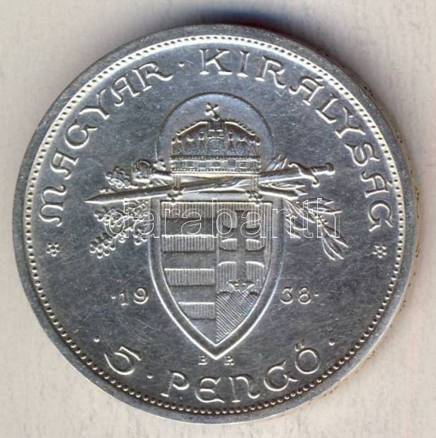 1938. 5P Ag "Szt István" T:1/2+ https://www.darabanth.com/de/113-Fernauktion/113.0/Numismatik/~100185/1938-5P-Ag-Szt-Istvan-T12plus~II290861