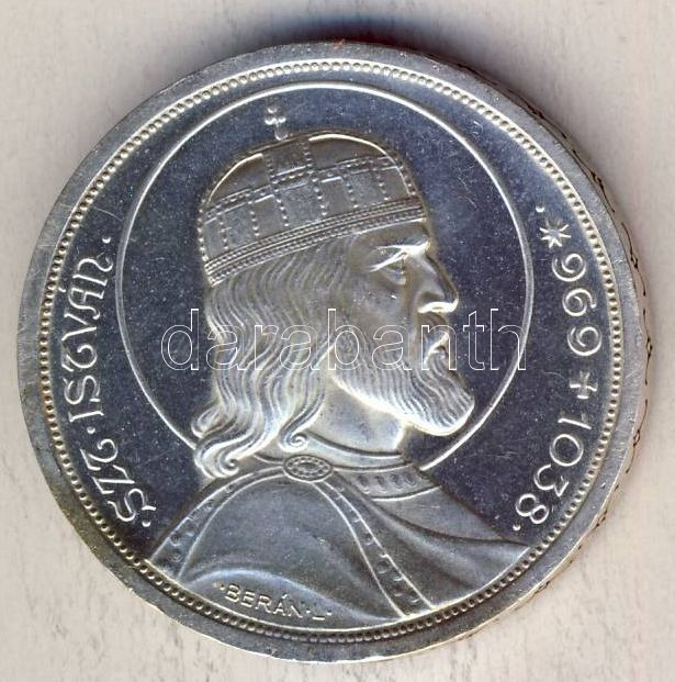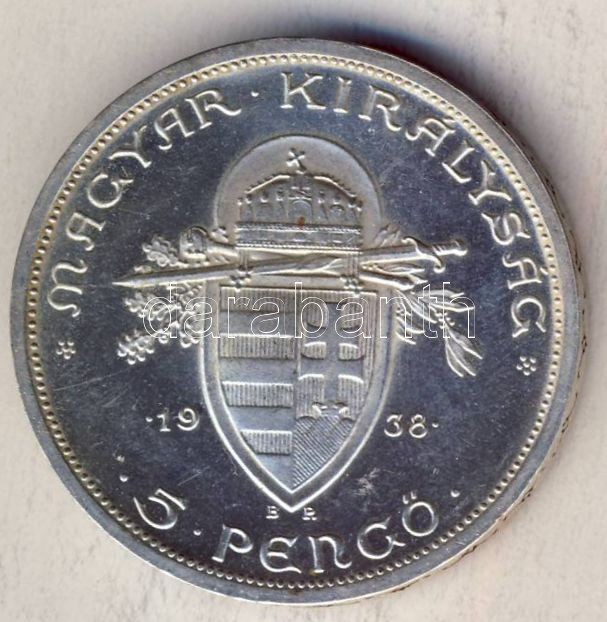 1938. 5P Ag "Szt István" T:1/2+ https://www.darabanth.com/de/113-Fernauktion/113.0/Numismatik/~100185/1938-5P-Ag-Szt-Istvan-T12plus~II290865