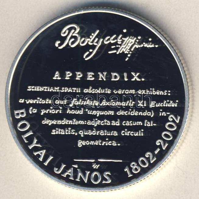 2002. 3000Ft Ag "Bolyai János" T:PP Csak 3000db! https://www.darabanth.com/de/113-Fernauktion/113.0/Numismatik/~100185/2002-3000Ft-Ag-Bolyai-Janos-TPP-Csak-3000db~II291665