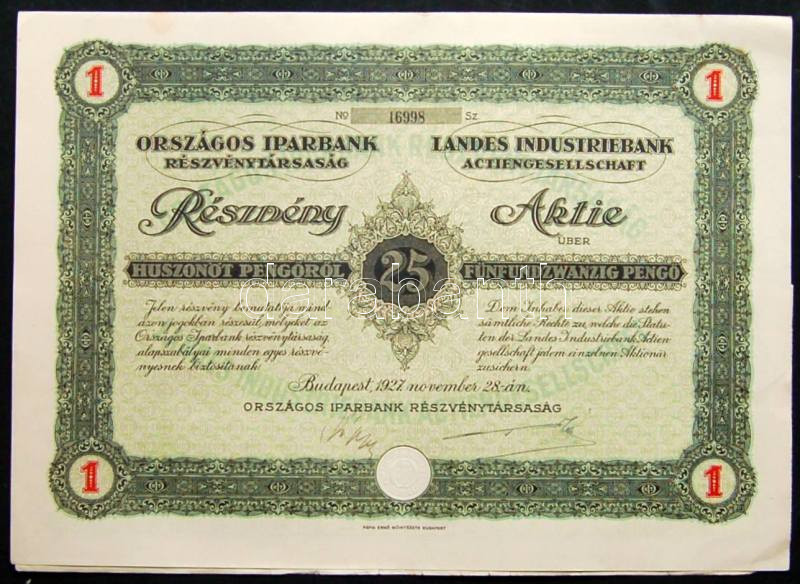 1927. "Országos Iparbank Részvénytársaság" részvénye 25P-ről, magyar é... https://www.darabanth.com/de/113-Fernauktion/113.0/Numismatik/~100190/1927-Orszagos-Iparbank-Reszvenytarsasag-reszvenye-25P-rol-magyar-es-nemet-nyelven-sze~II292133