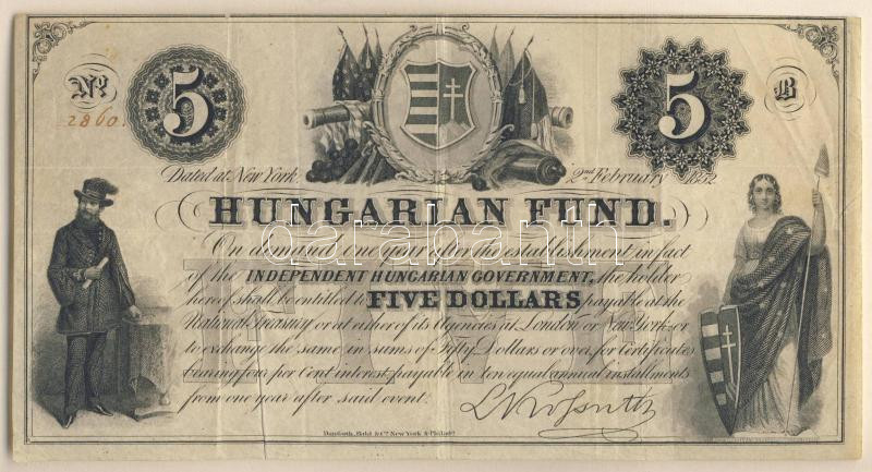 Emigrációs Kossuth-bankó 1852. 5$ "B" piros számozással T:II/III+ https://www.darabanth.com/de/114-Fernauktion/114.0/Numismatik/~413/Emigracios-Kossuth-banko-1852-5USD-B-piros-szamozassal-TIIIIIplus~II296016