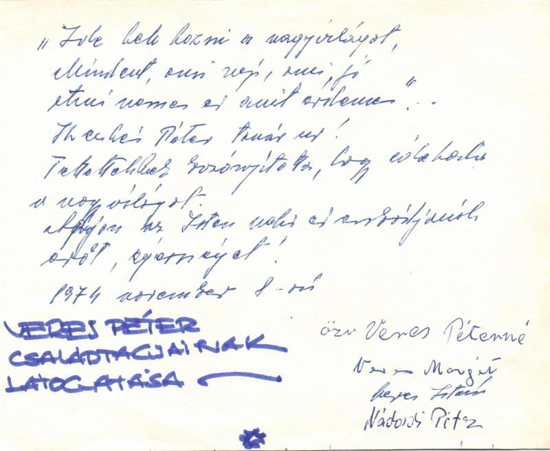 Beschreibung: 1974 Veres Péter író családtagjainak aláírása emléklapon (Özv. Veres Péterné, Veres Margit, Veres István és Nádasdy Péter újságíró)