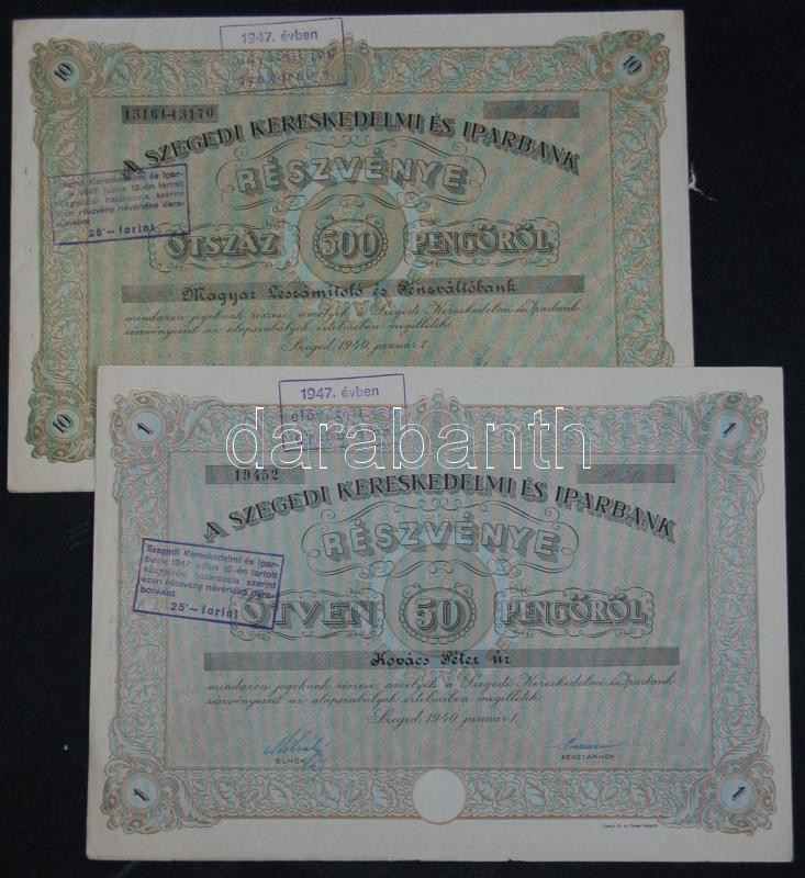 1940. "Szegedi Kereskedelmi és Iparbank" részvénye 50P + 500... https://www.darabanth.com/de/115-Fernauktion/115.0/Numismatik/~50172/1940-Szegedi-Kereskedelmi-es-Iparbank-reszvenye-50P-plus-500P-szelvenyekkel~II301530