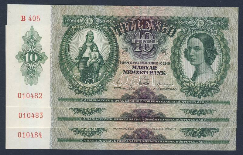 1936. 10P (3x) egymás utáni sorszámokkal T:I https://www.darabanth.com/de/116-Fernauktion/116.0/Numismatik/~332/1936-10P-3x-egymas-utani-sorszamokkal-TI~II303402