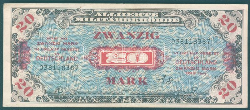 Beschreibung: Német 3. Birodalom / szövetséges megszállás alatt 1944. 20M USA-nyomat kilencjegyű sorszámmal T:II