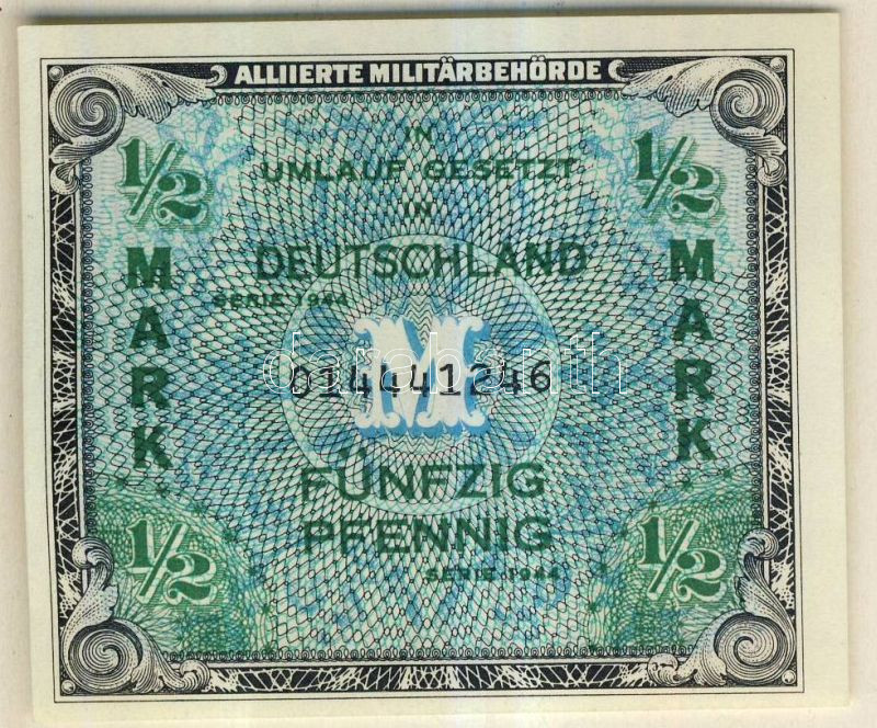 Németország szövetségi megszállás alatt 1944. 1/2M USA-nyomat kilencje... https://www.darabanth.com/de/117-Fernauktion/117.0/Numismatik/~30133/Nemetorszag-szovetsegi-megszallas-alatt-1944-12M-USA-nyomat-kilencjegyu-sorszammal-TI~II313019