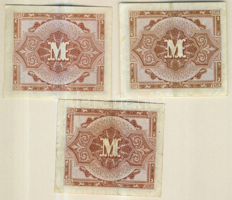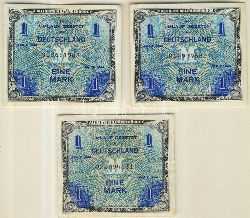 Beschreibung: Németország szövetségi megszállás alatt 1944. 1M (3x) USA-nyomat kilencjegyű sorszámmal T:II,III