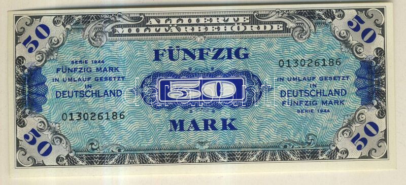 Beschreibung: Németország szövetségi megszállás alatt 1944. 50M USA-nyomat kilencjegyű sorszámmal T:I