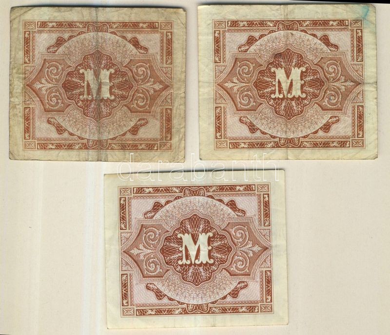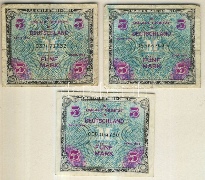 Beschreibung: Németország szövetségi megszállás alatt 1944. 5M (3x) USA-nyomat kilencjegyű sorszámmal T:III