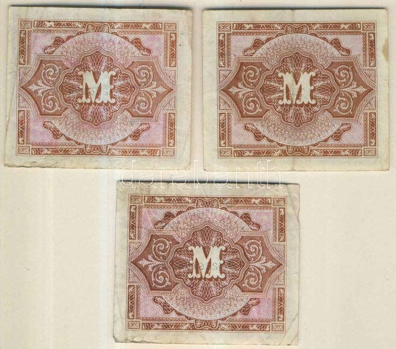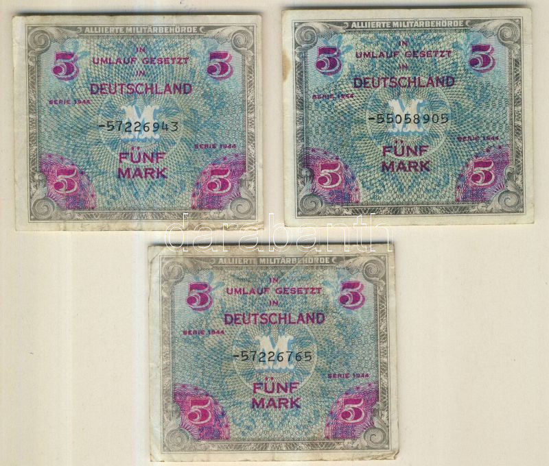 Beschreibung: Németország szövetségi megszállás alatt 1944. 5M (3x) szovjet nyomat nyolcjegyű sorszámmal T:III