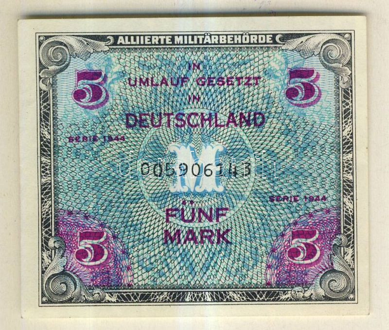 Beschreibung: Németország szövetségi megszállás alatt 1944. 5M USA-nyomat kilencjegyű sorszámmal T:I