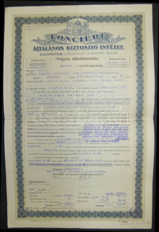 Beschreibung: cca 1934 Fonciere biztosító dekoratív biztosítási kötvény / Insurance bond