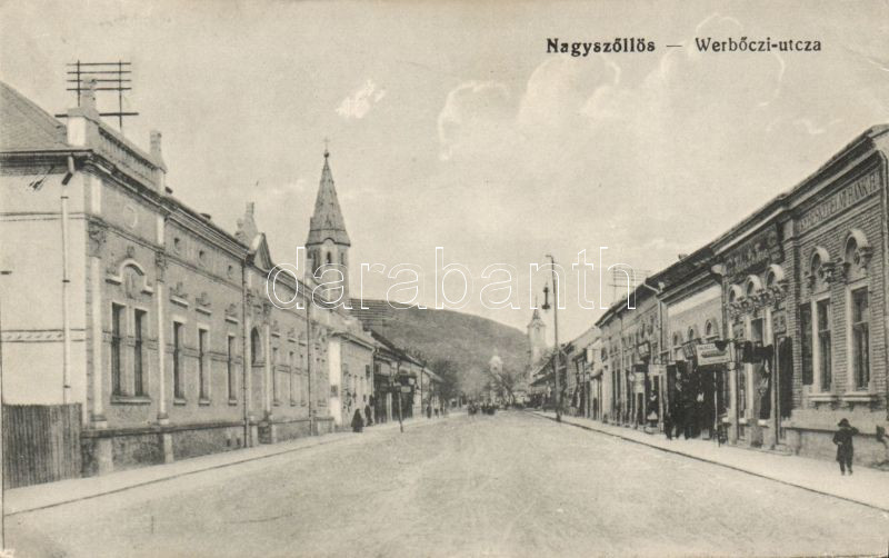 Nagyszőlős Werbőczi street with commercial bank (EB) https://www.darabanth.com/de/119-Fernauktion/119.0/Ansichtskarten/~10006/Nagyszolos-Werboczi-street-with-commercial-bank-EB~II319006