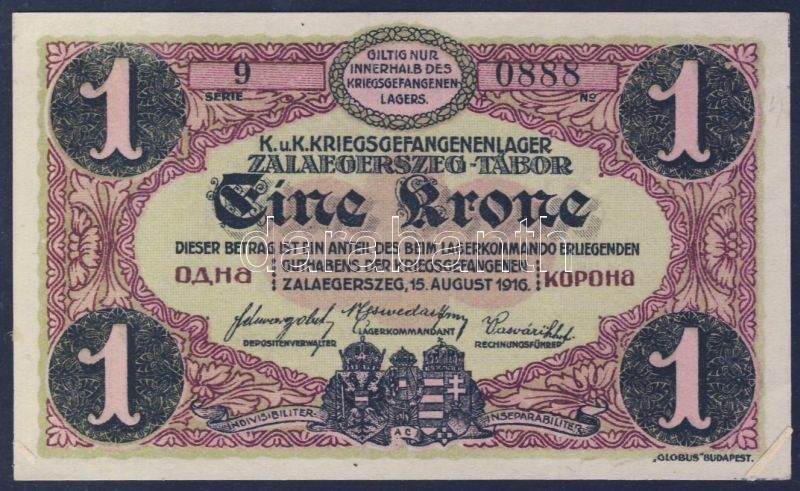 Zalaegerszeg/hadifogolytábor 1916. 1K T:I- két sarkán papírragasztó ny... https://www.darabanth.com/de/119-Fernauktion/119.0/Numismatik/~40183/Zalaegerszeghadifogolytabor-1916-1K-TI-ket-sarkan-papirragaszto-nyomokkal~II321500