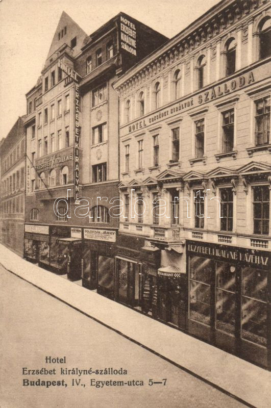 Budapest V. Egyetem utca Erzsébet királyné hotel https://www.darabanth.com/de/12-Gross-Auktion/12.1/Ansichtskarten/Ungarn~3499/Budapest-V-Egyetem-utca-Erzsebet-kiralyne-hotel~II415437