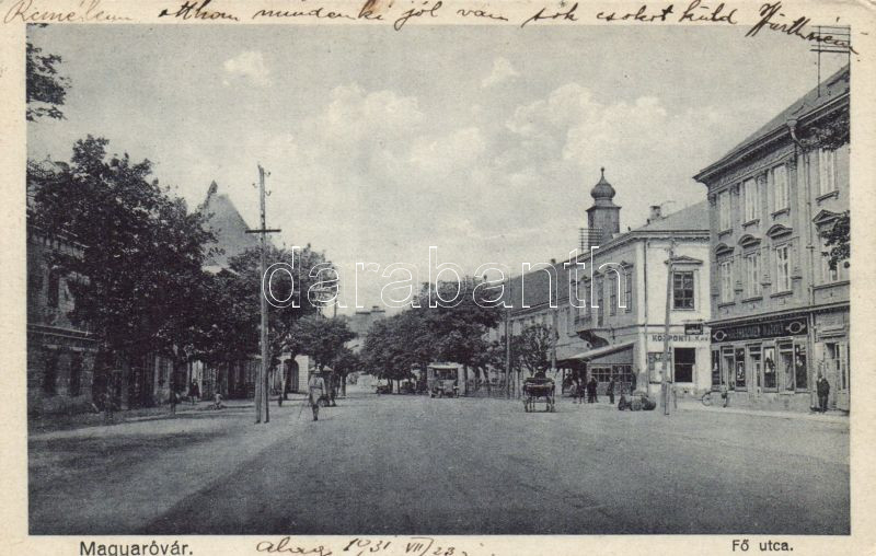 Beschreibung: Magyaróvár Fő utca a Központi Kávéházzal és Holzhammer Károly üzletével