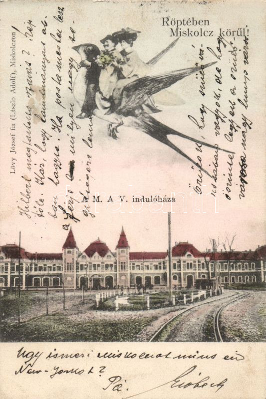 Miskolc MÁV Indóház és repülő pár https://www.darabanth.com/de/12-Gross-Auktion/12.1/Ansichtskarten/Ungarn~3499/Miskolc-MAV-Indohaz-es-repulo-par~II416932