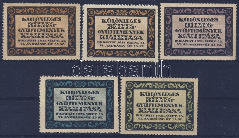 Beschreibung: 1921 Különleges bélyeggyűjtemények kiállítása 5 db fogazott reklámbélyeg