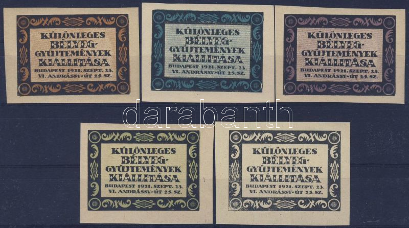 Beschreibung: 1921 Különleges bélyeggyűjtemények kiállítása 5 db vágott reklámbélyeg