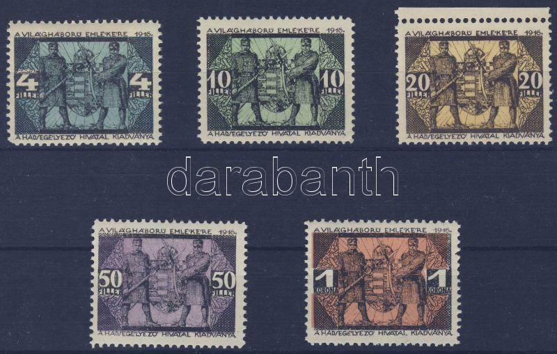 I. Világháború emlékére levélzáró sor, 5 db bélyeg https://www.darabanth.com/de/120-Fernauktion/120.0/Andere-Sammelgebiete/~365/I-Vilaghaboru-emlekere-levelzaro-sor-5-db-belyeg~II324206