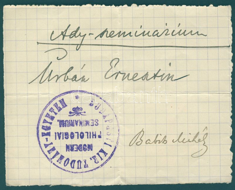 1918 Babits Mihály saját kezű aláírása az általa tartott Ady-szeminárium hallgatói jegyén a Budapesti kir. Tudományegyetem Modern Philologiai Seminarium pecsétjével / Signature of Mihaly Babits