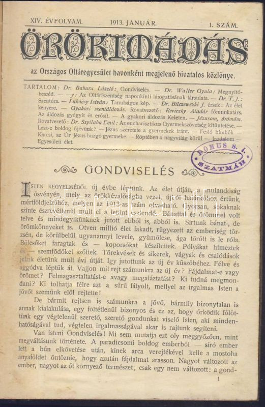 Beschreibung: 1913 Örökimádás a Központi Oltáregyesület hivatalos közlönyének januári száma, enyhén megviselt állapotban