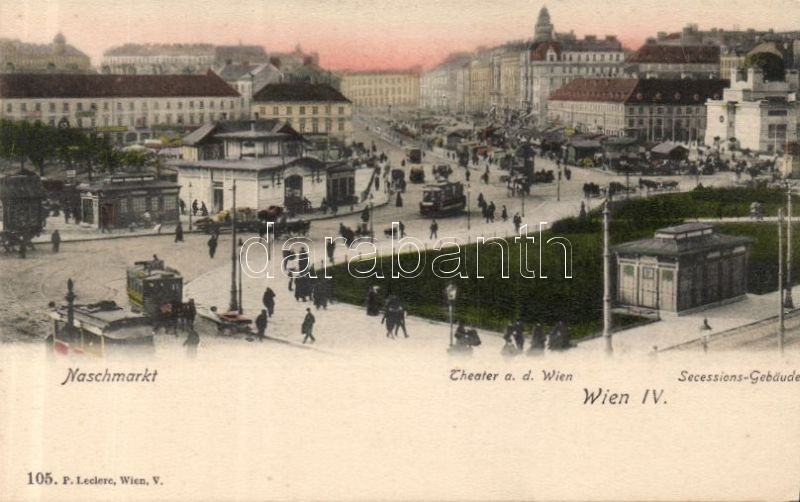 Beschreibung: Vienna Naschmarkt with theatre, art nouveau buildings and trams
