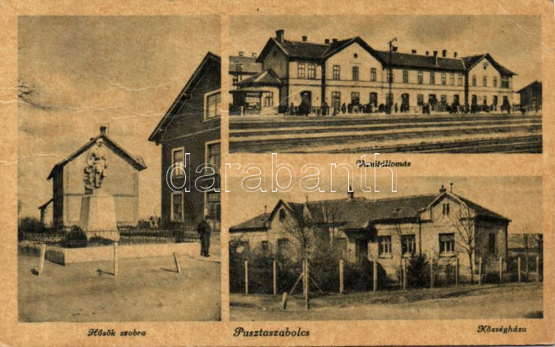 Beschreibung: Pusztaszabolcs hősi emlékművel és vasútállomással (fa)