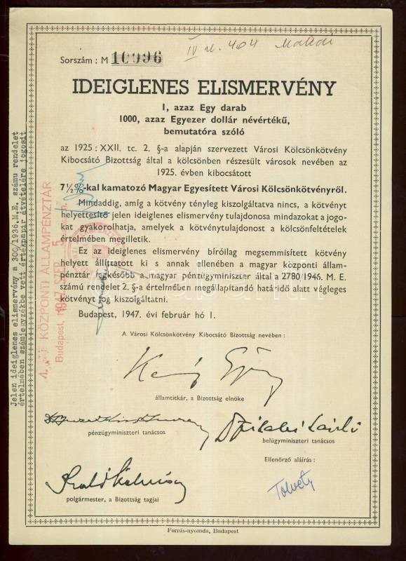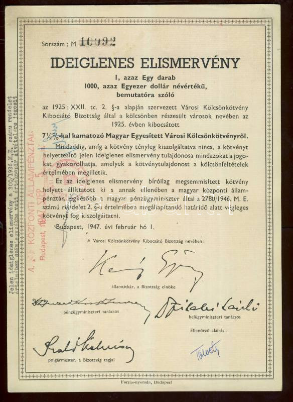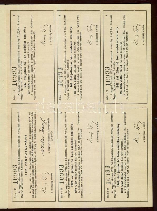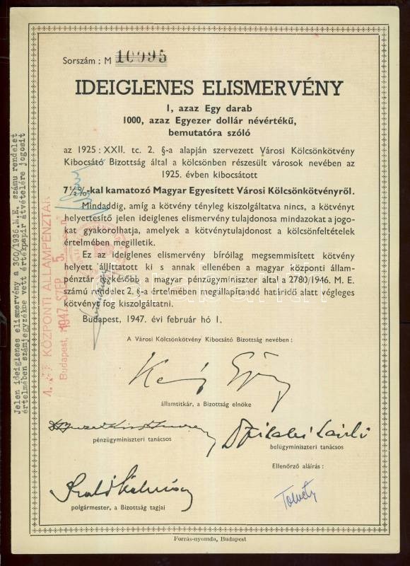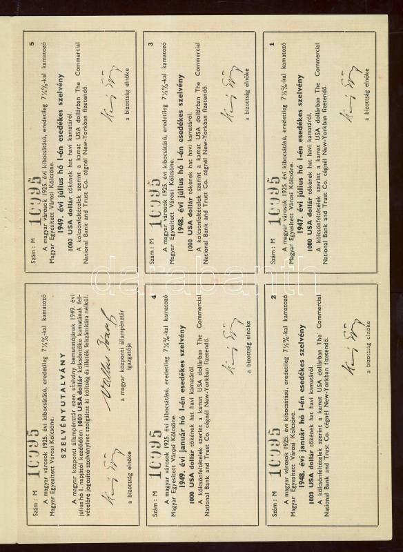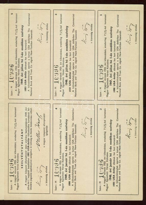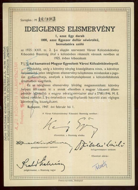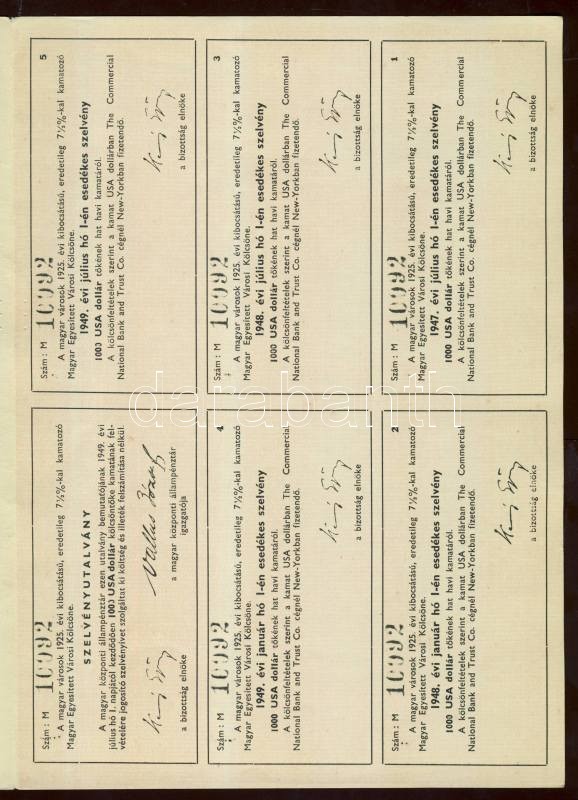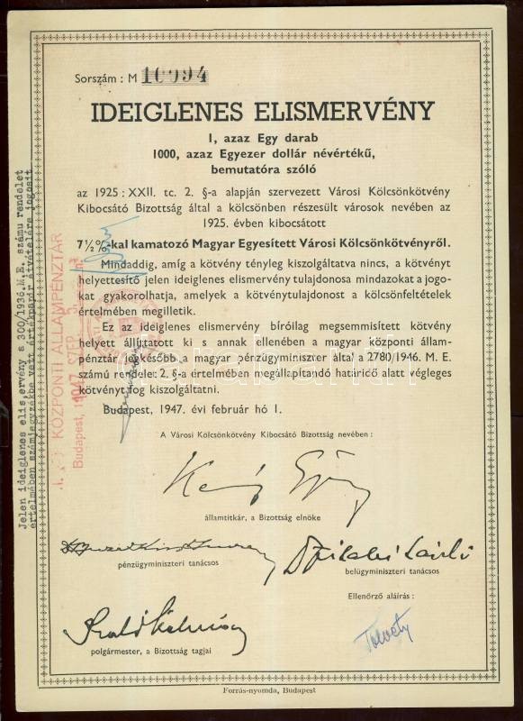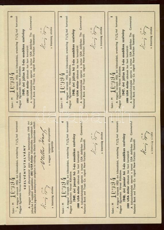Beschreibung: 1947. Kötvényhelyettesítő elismervény 1000$ névértékű Budapest/Magyar Egyesített Városi Kölcsönkötvény (5x)egymásutáni sorszámmal