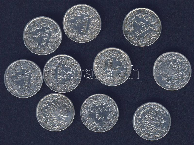 Német Birodalom/Császárság 1905-15 1/2M Ag (10x) mind klf évszámmal T:... https://www.darabanth.com/de/120-Fernauktion/120.0/Numismatik/~30253/Nemet-BirodalomCsaszarsag-1905-15-12M-Ag-10x-mind-klf-evszammal-T23-3~II326250