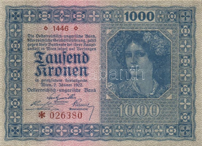 Ausztria / Osztrák-Magyar Bank 1922. 1000K (3x) T:I https://www.darabanth.com/de/120-Fernauktion/120.0/Numismatik/~30255/Ausztria-Osztrak-Magyar-Bank-1922-1000K-3x-TI~II319599