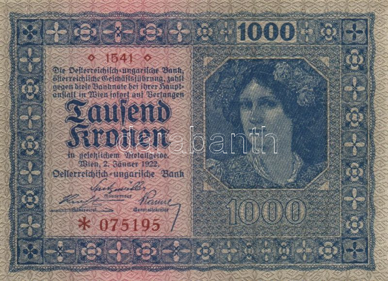 Ausztria / Osztrák-Magyar Bank 1922. 1000K (3x) T:I https://www.darabanth.com/de/120-Fernauktion/120.0/Numismatik/~30255/Ausztria-Osztrak-Magyar-Bank-1922-1000K-3x-TI~II319608