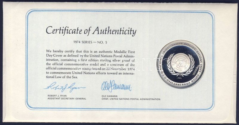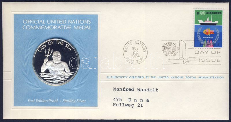 Beschreibung: ENSZ 1974. "Tengeri jog" Ag emlékérem ca. 20g megcímzett érmés borítékon elsőnapi bélyegzős bélyeggel, hátoldali tanúsítvánnyal, ismertetőkkel T:PP