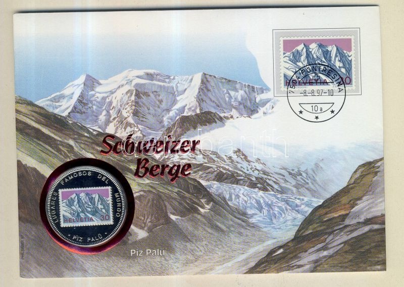 Beschreibung: Egyenlítői Guinea 1996. 1000Fr "Svájci hegyek - Piz Palü" multicolor emlékpénz érmés borítékon alkalmi bélyegzős svájci bélyeggel, ismertetővel T:PP
