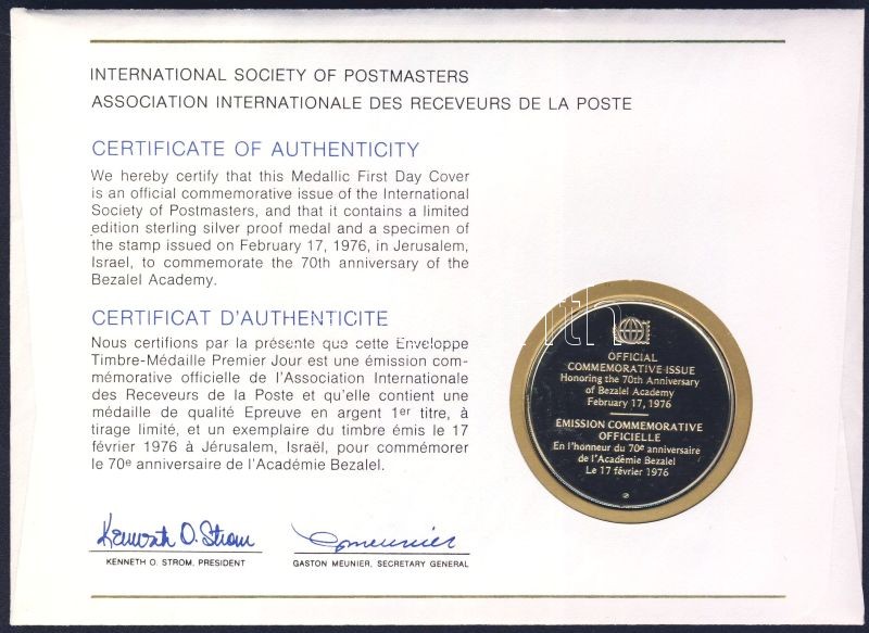 Izrael 1976. "Bezalel Akadémia" a Postamesterek gondozásában kiadott Ag emlékérem 20g érmés, bélyeges borítékon, izraeli bélyeggel, elsőnapi bélyegzővel, német nyelvű ismertetővel T:PP
