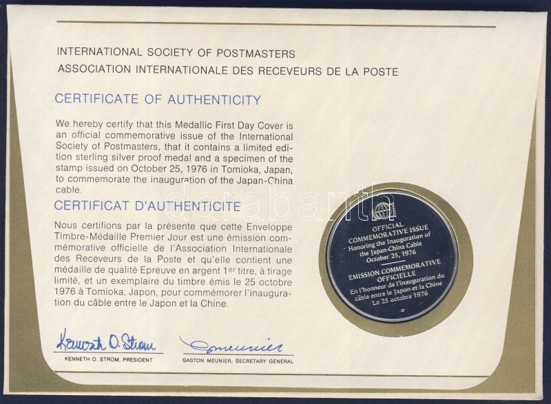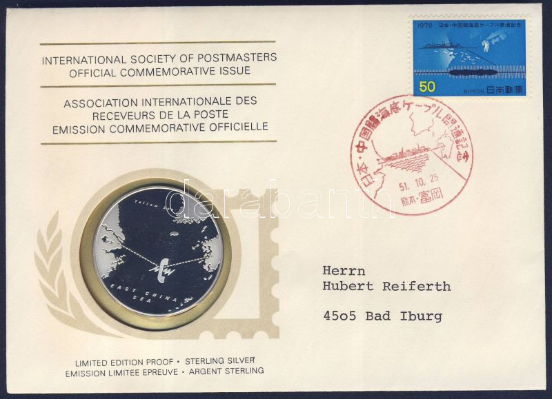 Japán 1976. "Japán-kínai mélytengeri kábel" a Postamesterek gondozásában kiadott Ag emlékérem 20g érmés, bélyeges borítékon, japán bélyeggel, elsőnapi bélyegzővel, német nyelvű ismertetővel T:PP