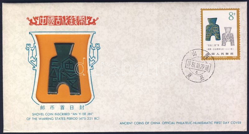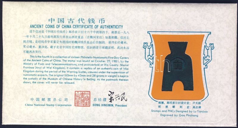 Kína/Hadakozó Államok korszaka/Wei királyság ie.475-221. lapátpénz "AN YI ER JIN" bevéséssel replikát érmés, bélyeges elsőnapi borítékon, hátoldali tanúsítvánnyal T:1