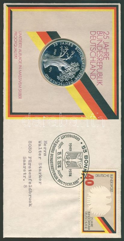 Beschreibung: NSZK 1974. "25 éves az NSZK" Ag emlékérem 24,23g érmés, bélyeges borítékon, alkalmi bélyeggel és elsőnapi bélyegzéssel, díszkiadásban! T:PP