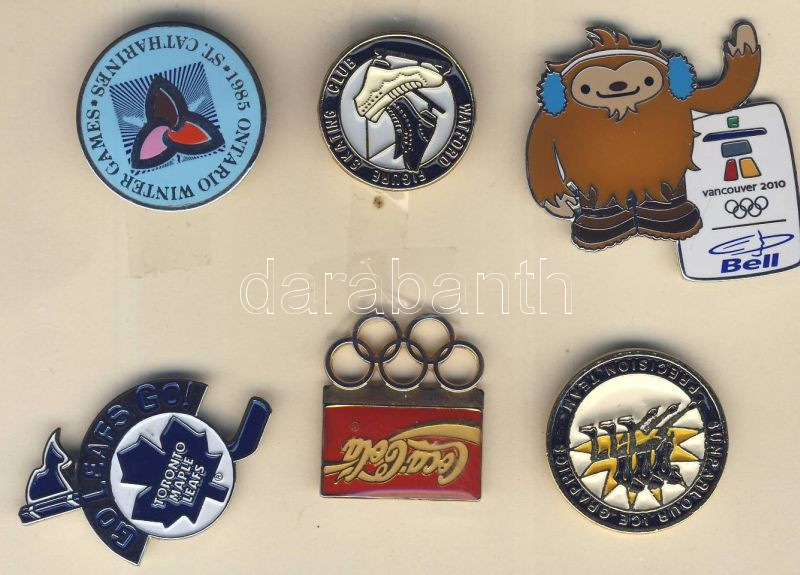Beschreibung: 6db klf sportjelvény, benne a 2010-es Vancouveri Téli Olimpia jelvénye T:1,2