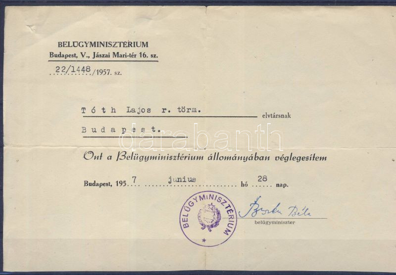 1957 Belügyminisztériumi véglegesítés Biszku Béla aláírásával https://www.darabanth.com/de/121-Fernauktion/121.0/Andere-Sammelgebiete/~343/1957-Belugyminiszteriumi-veglegesites-Biszku-Bela-alairasaval~II328420